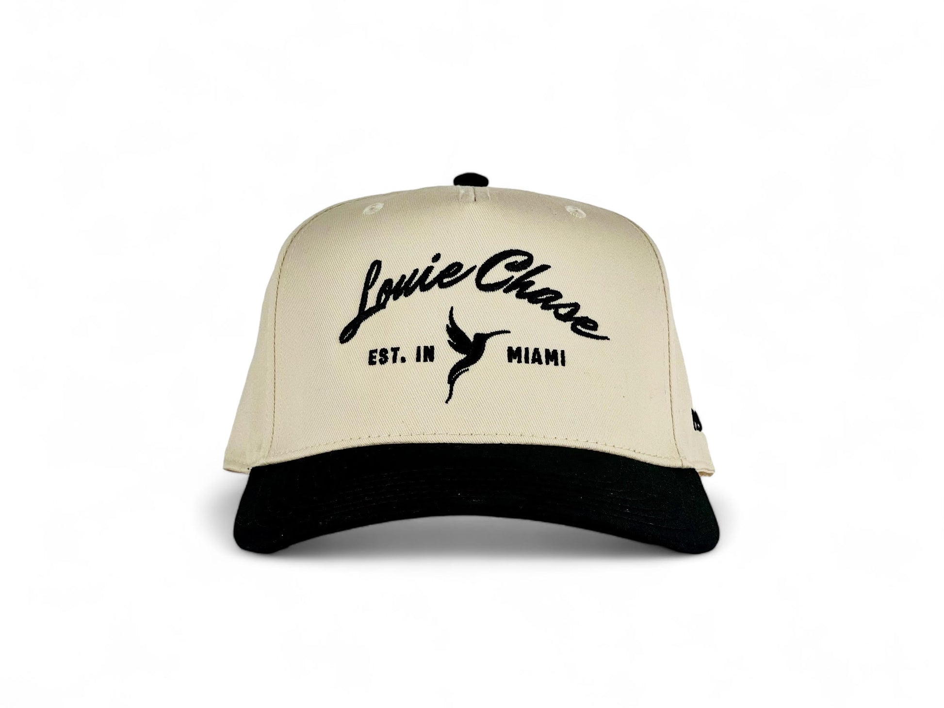 Black and Creme Two-Toned Five Panel Hat Featuring Black Louie Chase Embroidery.