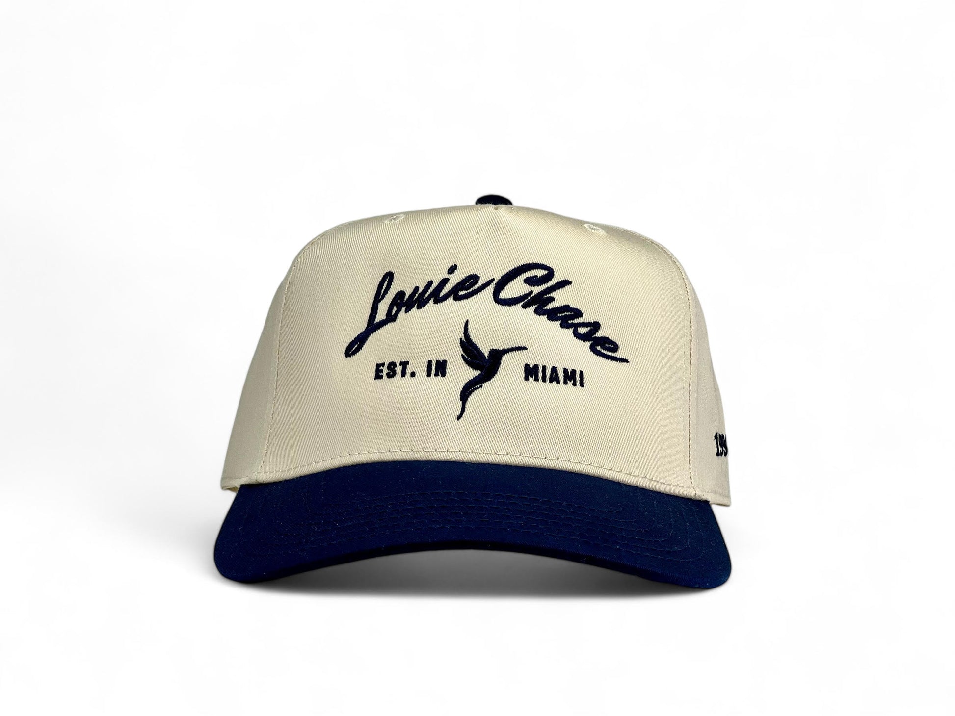 Navy & Creme Two-Toned Five Panel Hat Featuring Navy Louie Chase Embroidery.